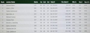 El jinete venezolano SAMUEL MARIN, quien llegó a 500 victorias en el exterior y marcha cómodo adelante en Tampa Bay, mantuvo el liderato en Norteamérica, con más carreras ganadas, ante la arremetida de José Luis Ortiz. Otros venezolanos entre los 10 mas ganadores son MYCHEL SANCHEZ (7mo) quien es líder en Parx Racing y SAMY CAMACHO (8vo). Mientras, los aficionados están pendientes de JARAMILLO quien domina en Santa Anita con ventaja de 4 primeros