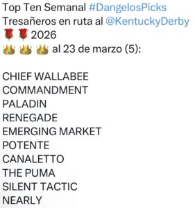 Para esta semana la ruta al Kentucky Derby tiene el Florida Derby en Gulfstream, la carrera de mayor importancia en los últimos años vía al Kentucky Derby en la que estarán presentes CHIEF WALLABEE con Alvarado, COMMANDMENT con Prat, THE PUMA con Castellano y NEARLY con Velazquez y también el importante Arkansas Derby en Oaklawn donde Irad estará sobre RENEGADE teniendo como máximo enemigo en el papel a SILENT TACTIC, mientras se espera mejor actuación ahora de otros que allí están inscritos, como BLACKOUT TIME, NAPOLEON SOLO y LITMUS TEST