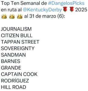 TAPPAN STREET, un potro al que le pusimos LA LUPA antes de debutar cuando incluso se estrenó victorioso, respondiendo como primera marca nuestra contra un gran favorito y luego tuvo un desliz en el Holy Bull, se exhibió como lo que prometió en su debut para imponerse en gran demostración en el Florida Derby, aprovechando los parciales dejados por los punteros y neutralizando el avance del favorito SOVEREIGNTY. Tiene un cruce de gran éxito que ya es un “nick, hijo de INTO MISCHIEF en madre por DISTORTED HUMOR, de varios excelentes corredores encabezados por LIFE IS GOOD y que también tiene el campeón de esta generación a los 2 años, CITIZEN BULL, incluso el de CORNUCOPIAN que se metió un tren suicida en el Arkansas Derby que le costó la carrera. Pupilo de Brad Cox con la monta de Luis Sáez es de una sociedad que lo compró de yearling en un millón de dólares en subasta de Fasig-Tipton en agosto 2023 en Saratoga. Actualizando, de 97 que han corrido luego que le hemos puesto LA LUPA, 59 han ganado clásicos de acuerdo con nuestro pronóstico: 60.82% de éxito y por allí GRAND JOB con espectacular victoria el viernes en Gulfstream, otra LUPA que esperamos responda ganando Clásicos