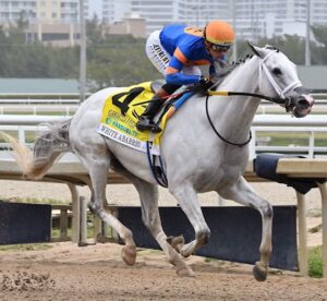 El vistoso tordillo WHITE ABARRIO galopó de tramite el sábado en Gulfstream donde en enero ganó la Pegasus World Cup. Guiado por Irad Ortiz, planean correrlo ahora en el Met Mile G1 el 7 de junio en Saratoga