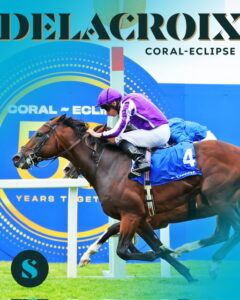 Impresionante DELACROIX, hijo de la gran campeona TEPIN por el gigante genético DUBAWI, ganando el importantísimo Coral-Eclipse Stakes en Sandown, Inglaterra. Corriendo un poco embotellado, pero cazando la carrera, al final tuvo tiempo para despejar el camino y alcanzar casi sobre la raya quitarle el manjar de la boca a OMBUDSMAN. Con la dupla de oro Ryan Moore y Aidan O’Brien y del trío de la eficiencia Smith, Magnier y Tabor, la gente del Coolmore. TEPIN fue sextuple ganadora G1 en su campaña con 13 victorias corriendo hasta los 5 años