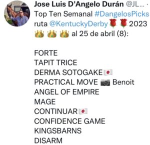 Transcurre la cuenta regresiva para el Kentucky Derby el sábado 6 de mayo en 2000 metros en Churchill Downs. BLAZING SEVENS de Chad Brown no lo van a correr y su vacante la agarró JACE ROAD con lo cual ahora el entrenador Brad Cox tiene 4 adentro. Las casas de apuestas tienen como favoritos a FORTE y TAPIT TRICE mientras en el tercer lugar están empatados el japonés DERMA SOTOGAKE, el de Pensilvania ANGEL OF EMPIRE y el que viene de California PRACTICAL MOVE. En la lista de espera están SKINNER, CYCLONE MISCHIEF, MAJOR DUDE y el tercer nipón MANDARIN HERO. Por cierto, con una cuantiosa inversión, reinició actividades la pasada semana, totalmente remodelado, el hipódromo de Kyoto uno de los mas importante de Japón… Al cierre, Javier Castellano regresa a la silla de MAGE, el pupilo de Gustavo Delgado, para el Kentucky Derby… Ilustramos la columna con foto del final del año pasado del Kentucky Derby ganando RICH STRIKE dando una sorpresa histórica con el jinete venezolano Sonny León