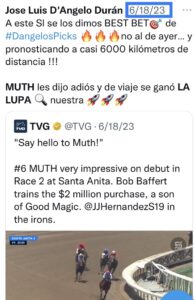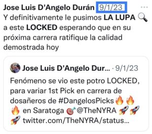 Y este domingo a las 11 am pendientes con el spaces de Sábato D´Angelo @sabatosports ULTIMO MINUTO. Otra vez nos fue muy bien, de 10-9 con 4 primeras marcas incluyendo el datazo de Sábato Super Doc y la mia de Luna Victoria al cierre. … Y suscríbanse a nuestro Canal de YouTube LOS DANGELO y sígannos en twitter @JLDangeloDuran y en Instagram @joseluisdangeloduran allí están los #DangelosPicks con el Factor Dangelo el de los altos dividendos… Muy contento por haber superado los 50.000 seguidores en twitter, gracias a todos por su respaldo!!!