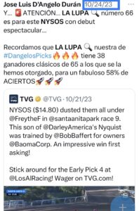 Sábato D´Angelo @sabatosports acertó los 6 ganadores con la línea de Melosa y la tremenda primera marca del debutante Rey de Copas en su ya famoso spaces ULTIMO MINUTO de los domingos a las 11 de la mañana justo cuando logramos una audiencia record en vivo y directo, con razón todo el mundo habla de ese programa… Suscríbanse a nuestro Canal de YouTube LOS DANGELO todo un éxito, el domingo 5 primeras marcas y muy buena la información de Strength Arnor y sígannos en twitter @JLDangeloDuran y en Instagram @joseluisdangeloduran allí están los #DangelosPicks con el Factor Dangelo el de los altos dividendos, con 5 primeros picks sábado y domingo de más de 10 dólares a ganador !!!