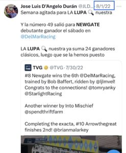 Otro éxito para LA LUPA nuestra alcanzamos el domingo con el triunfo de NEWGATE en el Santa Anita Handicap G1 en 2000 metros con gran conducción de Frankie Dettori de nuevo en dupla con Baffert, doble flying dismount. Por cierto, pusimos LA LUPA número 72 a la prospecto tresañera IMPEL, ganadora al galope el domingo en Oaklawn Park… NEWGATE es uno de los 41 ganadores clásicos que tenemos con LA LUPA de los 70 que han corrido después de recibirla (59%)
