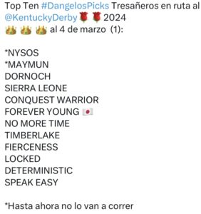 DORNOCH, el hermano completo de MAGE, guiado por el panameño Luis Sáez, con lo necesario, se llevó el Fountain of Youth en Gulsftream, carrera que al final quedo desmantelada con el retiro de sus 3 grandes enemigos en el papel y que es especie de preparatoria para el famoso Florida Derby vía al Kentucky Derby. Su entrenador Danny Gargan dijo que ahora decidirán cual es su próxima carrera, el Florida Derby allí mismo el 30 de marzo o el Blue Grass en Keeneland el 6 de abril. Esta semana camino al Kentucky Derby tendremos el Tampa Bay Derby en 1700 metros
