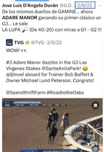 El sábado ADARE MANOR otro éxito de LA LUPA se llevó de galope el Apple Blossom Handicap en Oaklawn Park en 1700 metros con la combinación de Juan Hernández y Bob Baffert, su segundo G1. LA LUPA nuestra tiene 42 ganadores clásicos de 72 que han corrido después que se la hemos otorgado, 58% de éxito. ADARE MANOR por UNCLE MO, se la pusimos el 2 de junio de 2022, después de ganar Las Virgenes Stakes G3 con miras ganar G1 y G2 y después de eso lleva alcanzados 2 G1 y 3 G2