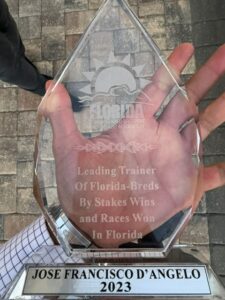 Jose Francisco D´Angelo el popular Kikito sigue cosechando éxitos en Norteamérica. Anoche lunes fue galardonado por la FTBOA (Florida Thoroughbred Breeders and Owners Association) como entrenador líder por clásicos ganados y carreras ganadas con ejemplares de Florida, aparte de lograr con BENTORNATO el título de Campeón Dosañero 2023. Ilustramos esta columna con foto de Juan Carlos Feijoo de Hipismo.Net con José Francisco acompañado por su padre Kiko D´Angelo luego de recibir el galardón de la FTBOA
