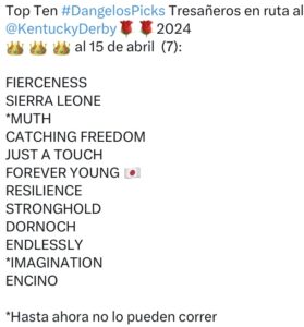 ENCINO del Godolphin ingresó entre los 20 clasificados al Kentucky Derby luego de su triunfo el sábado en el Lexington Stakes que lo colocó en el puesto 21 y la lesión sufrida el domingo por NO MORE TIME, el orgullo de Iowa y pupilo de Kikito D´Angelo que estaba entre los 20. ENCINO es otro éxito para su entrenador Brad Cox y su padre NYQUIST. Por cierto, el japonés FOREVER YOUNG ya llegó a Churchill Downs y ayer lunes se informó que un juez decidirá esta semana si los de Baffert pueden correr el Kentucky Derby o no, decisión que pudiera alterar la tabla de clasificación
