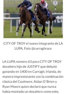 CITY OF TROY estuvo contundente en su triunfo en el Epsom Derby el sábado despejando cualquier duda tras perder su invicto en las 2000 Guineas. Campeón a los 2 años y Líder Tresañero, nacido en Estados Unidos tiene ahora campaña total de 5-4. Del Coolmore, hijo del triplecoronado estadounidense JUSTIFY en la notable FOREVER TOGETHER, por GALILEO, le dio el décimo Derby a su entrenador Aidan O´Brien quien nuevamente hizo dupla con el jinete Ryan Moore. Por delante tiene el Derby Irlandés el 30 de junio, el King George and Queen Elizabeth el 27 de julio, el St Leger Inglés el 14 de septiembre, aclarando que se mantiene la posibilidad de llevarlo a USA a correrlo en el Travers Stakes en Saratoga cuya fecha es el 24 de agosto, idea que lanzó su entrenador desde antes de las 2000 Guineas. Ilustramos esta columna con la famosa foto publicada por @GBRacing con CITY OF TROY ganando el Derby de Epsom