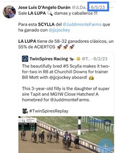 Luego de CITY OF TROY, gran acierto de LA LUPA, el mismo sábado en USA, en Churchill Downs, la yegua SCYLLA, con Javier Castellano y los colores del Juddmonte, pupila de Bill Mott, se convirtió en el ganador clásico numero 43 de los 70 que han corrido después de recibir LA LUPA nuestra, elevando su nivel de aciertos a 61%, al ganar el Shawnee Stakes con lo que su campaña ahora es de 6-4
